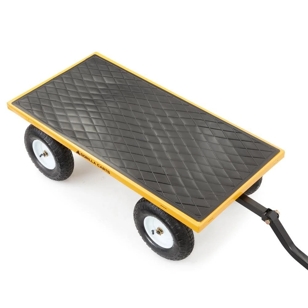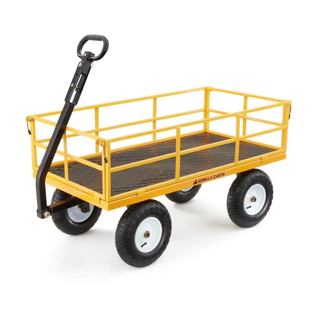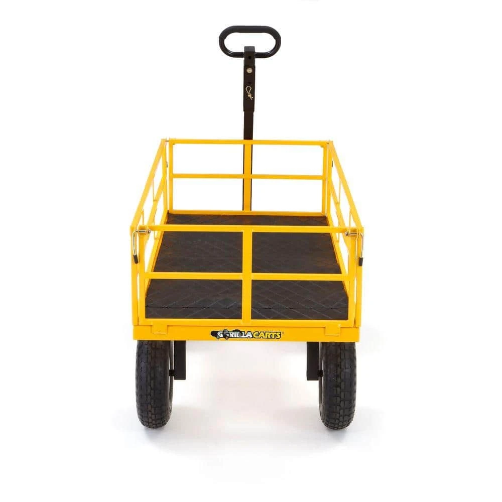 Transport and store yard, garden or farm tools securely with this Gorilla Cart Heavy Duty Steel Utility Cart. It lets you move up to 1,200 lbs. of supplies so you always have what you need within easy reach. The strong frame gives it superior maneuverability without sacrificing durability. It features an innovative, updated design for easy and fast assembly.