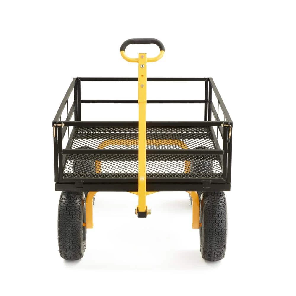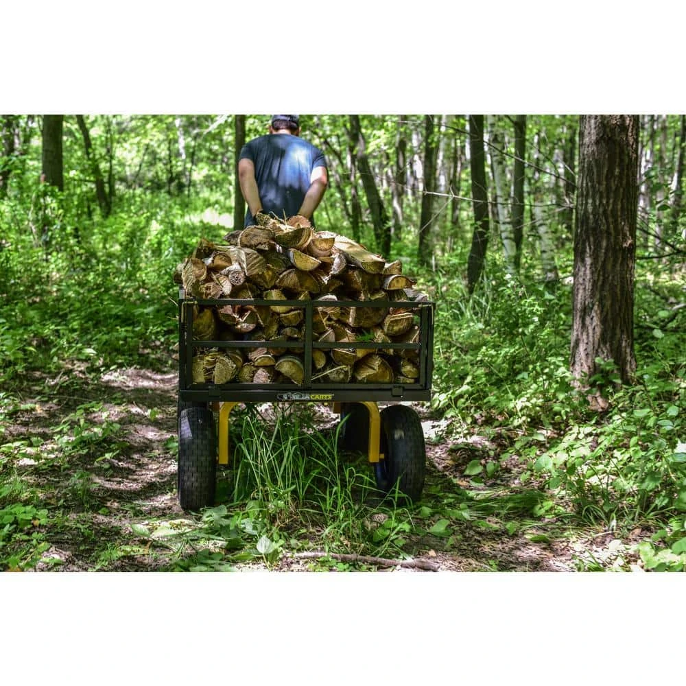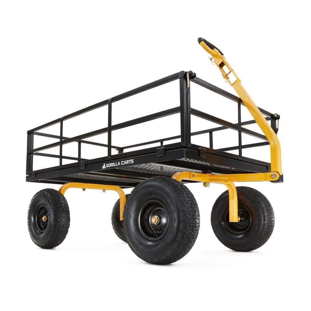 The Gorilla Carts Super Heavy-Duty Steel Utility Cart has a huge, tough oversized steel mesh bed for the biggest hauling jobs. The 1,400 lb. weight capacity and oversized 15 in. pneumatic tires make this heavy-duty cart perfect for moving anything around the yard, field or farm. The innovative frame design minimizes the number of parts that need to be assembled and offers excellent maneuverability and rigidity. The removable sides provide added versatility when carrying larger items, like logs or fence posts. The 2-in-1 convertible handle can be pulled by hand or easily converted to a hitch for hauling behind a tractor. This heavy-duty cart is durable, strong and built to last.