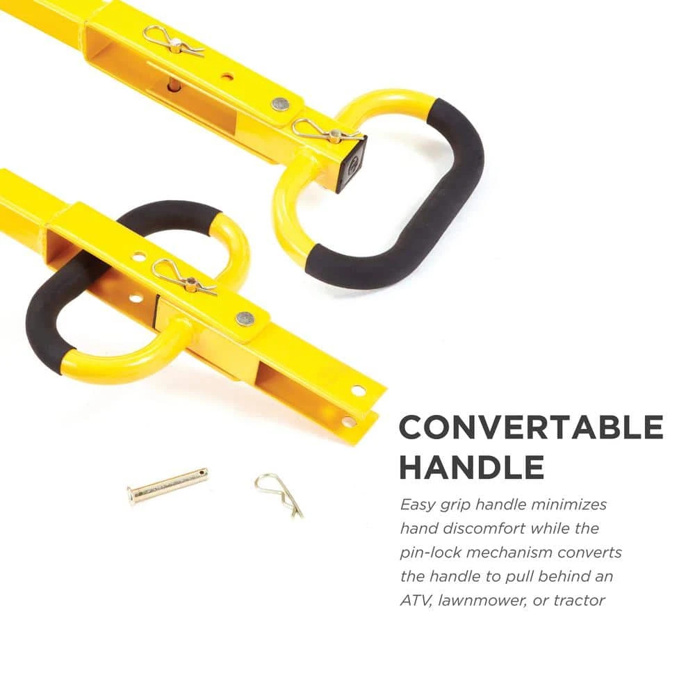 - Patented 2-in-1 heavy duty handle can be pulled by hand or towed