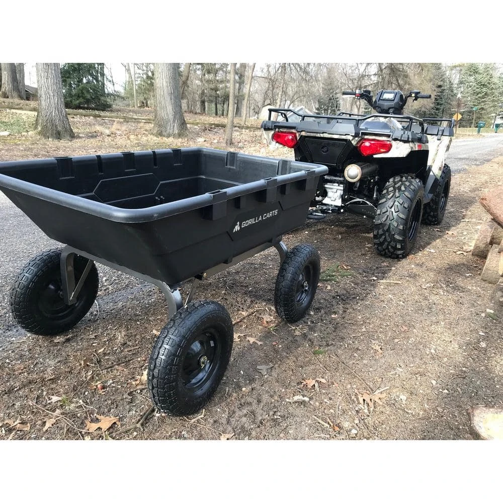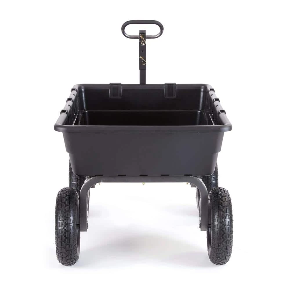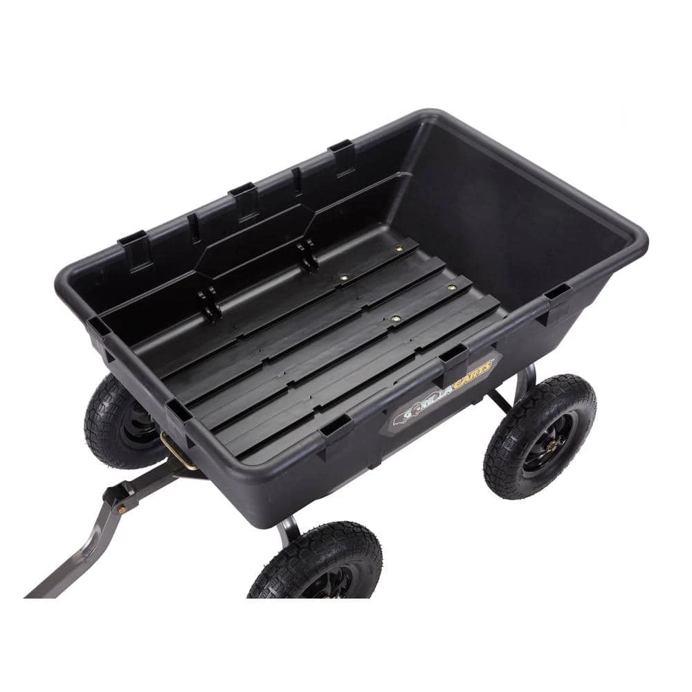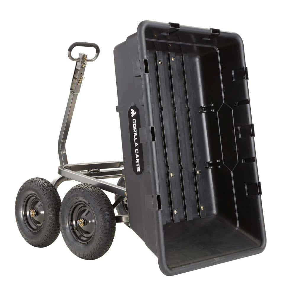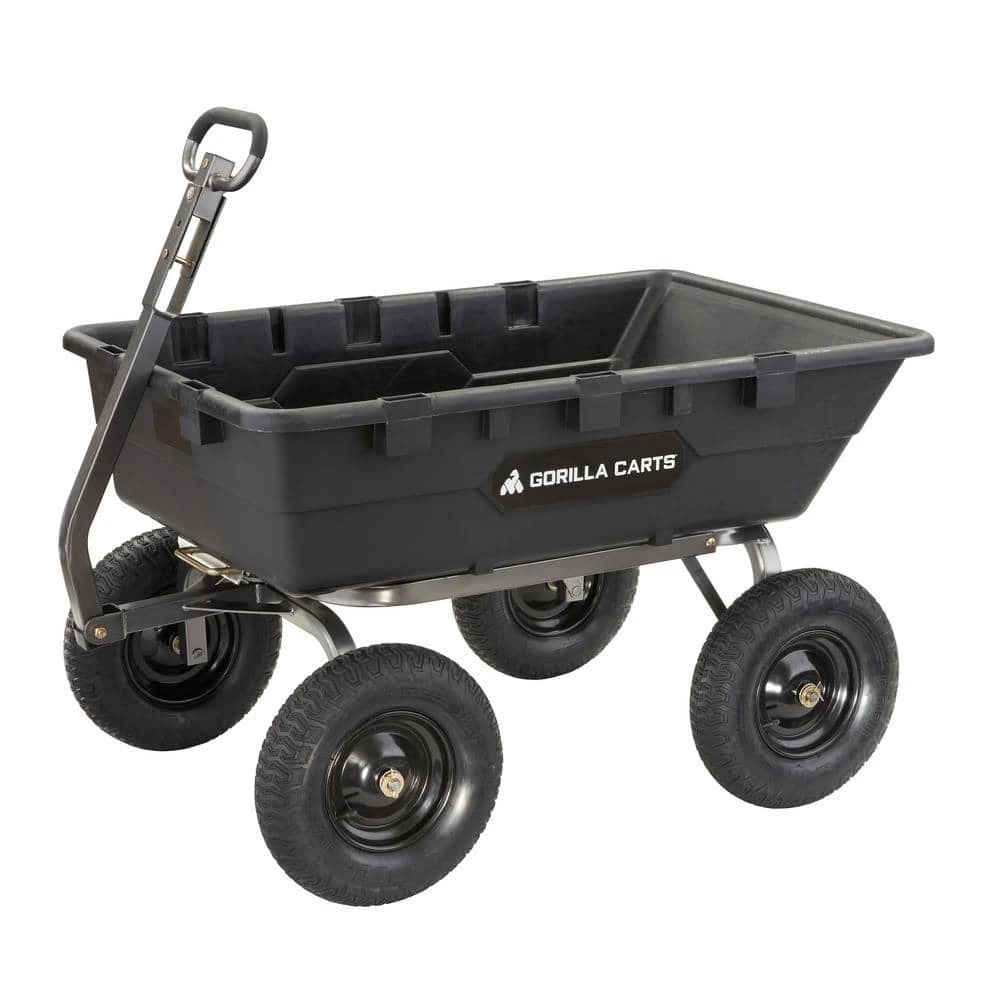 The newly designed Gorilla Carts Heavy-Duty Dump Cart has innovative, updated frame design that makes is quick and easy to assemble. Improved maneuverability and rigidity gives the cart a tight turning radius. Haul more with each load and finish the job faster and more efficiently with the high-strength poly bed and 10 cu. ft. capacity. The patented 2-in-1 handle with durable grip allows the cart to be hooked-up and towed behind a lawn tractor or ATV or pulled easily by hand. Heavy duty 16 in. pneumatic tires keep this workhorse on the move and the patented dump feature allows the bed to tilt for easy unloading while keeping the cart balanced to prevent tipping. With a hauling capacity of 1,500 lbs., the GOR10-16 is the largest in the Gorilla Carts line of dump carts.