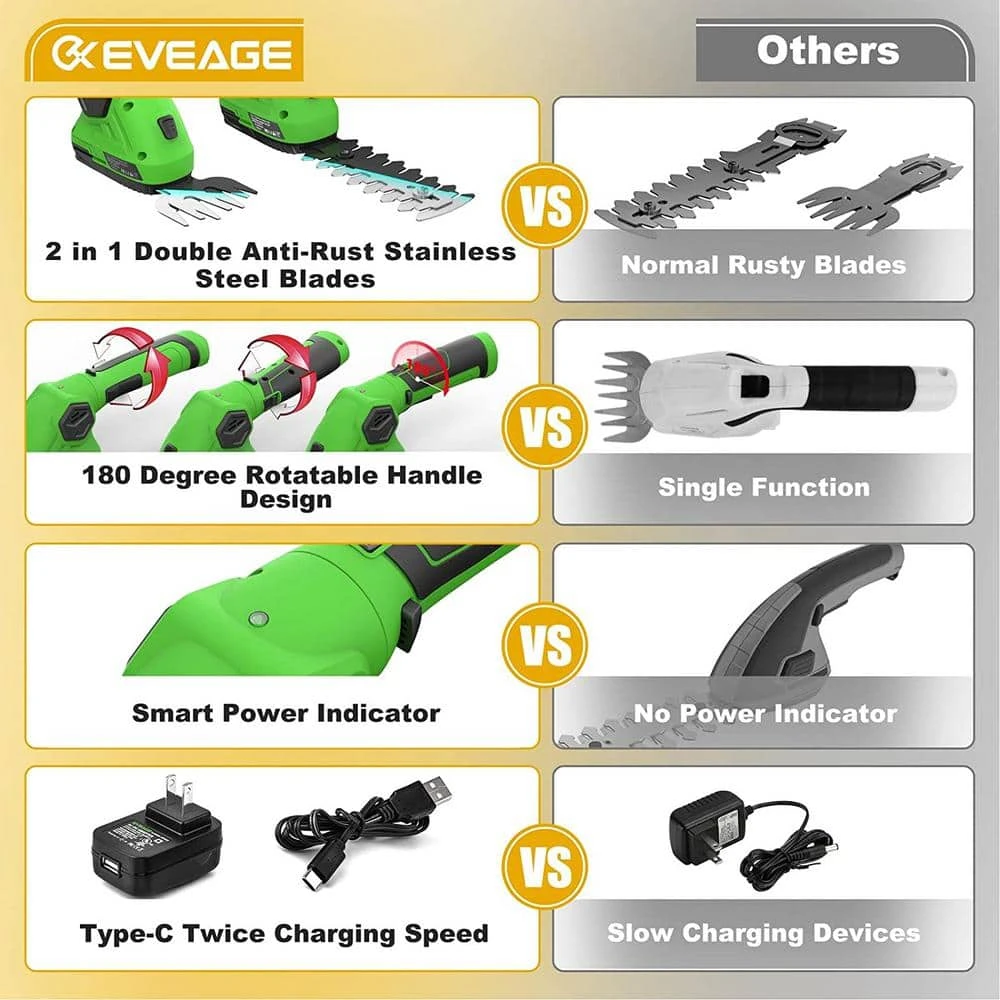 2-In-1 Feature Free Switching Between Maximum Width 3.15 in. Cordless Grass Shears And Maximum Cutting Length 4.73 in. Power Hedge Trimmers, Easy To Finish Your Garden Work, No Longer Feel Tired. Double Security Our Handheld Grass Trimmer Is A Durable And Safe Tool. Double Lock Design Of Child Safety Lock And Security Key Make It Safe Enough, For Both Children And Adults. Light Duty Tools With Light Weight (Only 2.5 lbs.) Suitable For Small Work, You Won’t Be Exhausted In A Trim When Using Power Small Hedge Trimmer. We Did Anti-Rust Technology Based On The Original Metal Blades, Which Makes The Cordless Hedge Trimmer Have Longer Lifespan. It Is A Good Choice For Small Gardens, Hedge Grooming And Areas Your Mower Cannot Reach. Portable Efficient Electric Grass Clippers Design With 1100 spm Motor, 8-Volt 2000mAh Rechargeable Battery, 3 Color Lights Show, Type-C Cable Charging, Can Be Full-Charged Within 45-Minutes, Provides Higher Efficiency For Your Pruning Work. Ingenious Design Ergonomics Design Portable 180ยฐ Rotatable Handle Design And The Compact Design, Hope You Could Have A Good Mood in Trimming. Package Body of hedge trimmer x 1 Grass shear blade x 1 Hedge trimmer blade x 1 Blade guard x 2 Charger plug x 1 Charger cable x 1 Safety key x 2 Manual x 1.
