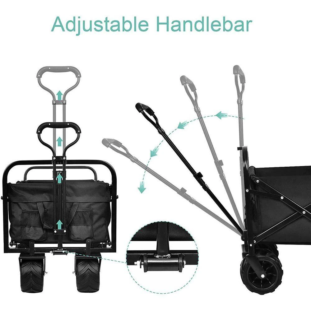 - Collapsible wagon is equipped with adjustable handles, you can choose to push or pull it, the handle is designed with round grips, which is more ergonomics, it’s effortless for you to push or pull