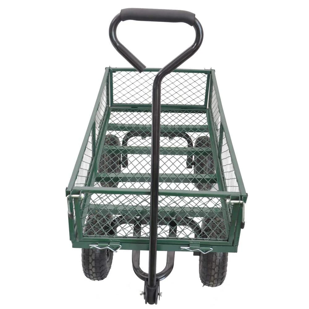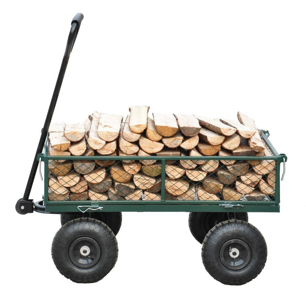 This garden cart makes it easier to transport firewood, plants, chicken feed, potted soil and honeycombs. The detachable side on the foldable utility wagon increases versatility when carrying larger loads. The practical garden trolley bears 550 lbs., so it is strong enough to carry heavy work. You don’t have to drag heavy materials to the original place on multiple trips. Heavy reinforced steel frame, 180ยฐ steering range handle control and 10 in. (about 25.4 cm) pneumatic tires make this garden utility vehicle stable and ready to help you complete tasks in the yard.