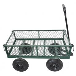 The utility cart with a heavy-duty reinforced steel frame to help you transport projects of many sizes is very durable and sturdy for year-round use. With detachable 4 sides, it is easy to load and unload different items. When you need to carry larger loads, simply lower or remove the side panel to quickly turn it into a flatbed cart, a practical design. The rotatable handle helps you to use this garden cart more easily and flexibly. 10 in. pneumatic tires with a wide wheelbase provide good stability and balance for excellent maneuverability on most terrains. It is a good solution to transport various items, and it is very suitable for use in hotels, gardens, homes, orchards, warehouses, factories, etc.