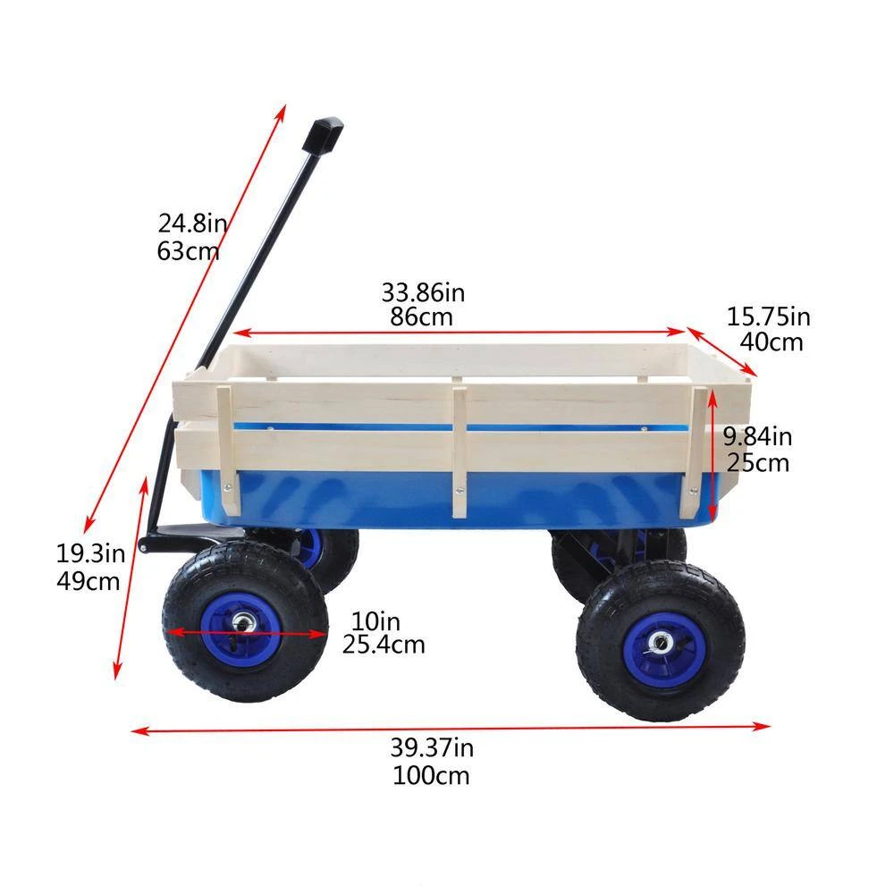 This big foot panel wagon has an all-steel construction, rugged air tires and wooden stake sides, which is great for your kids or grandkids to play with. The wagon can haul gardening tools or supplies in the yard. It has a large loading capacity of 176 lbs. The extra-long handle is foldable under for easy storage. The wooden panels in the side are removable.