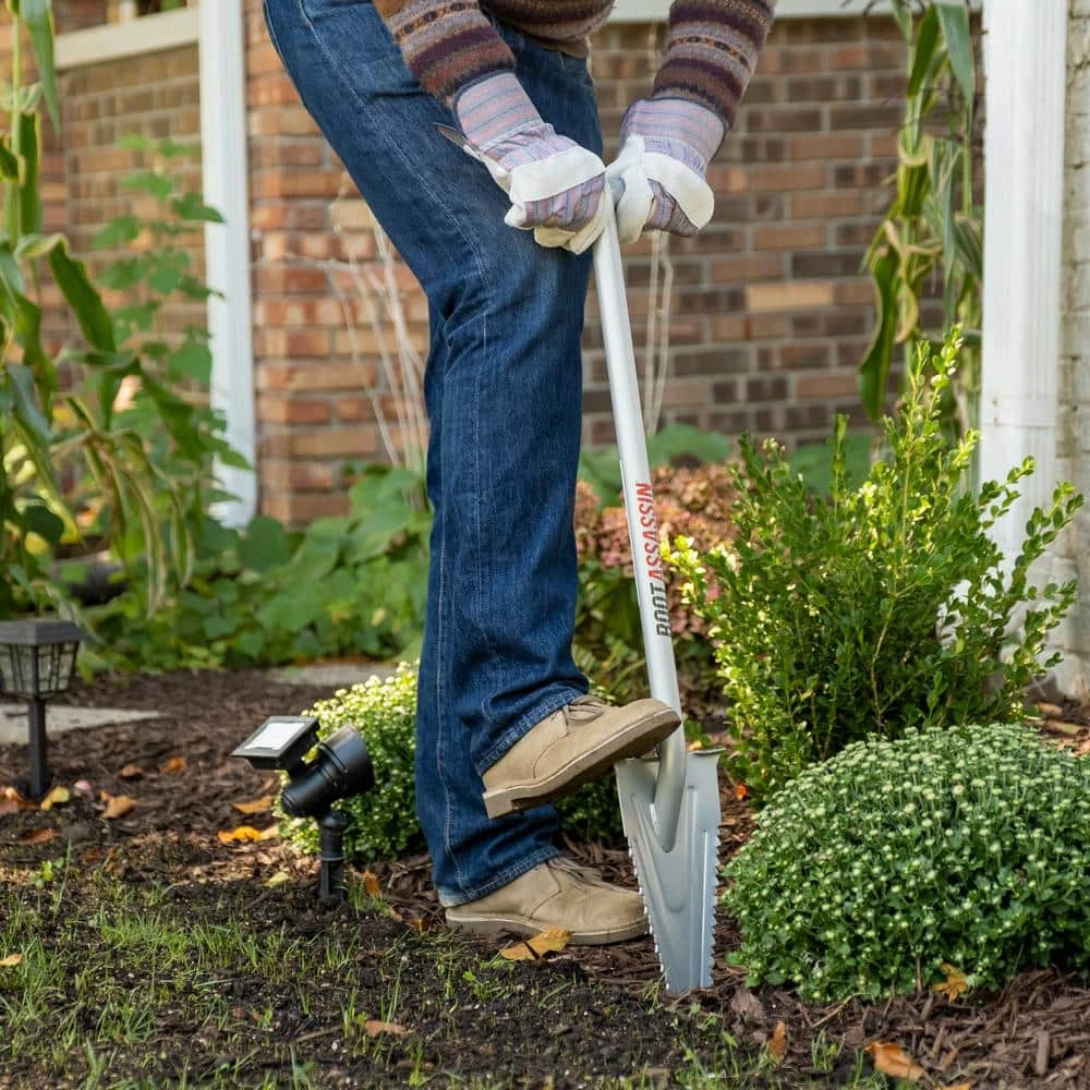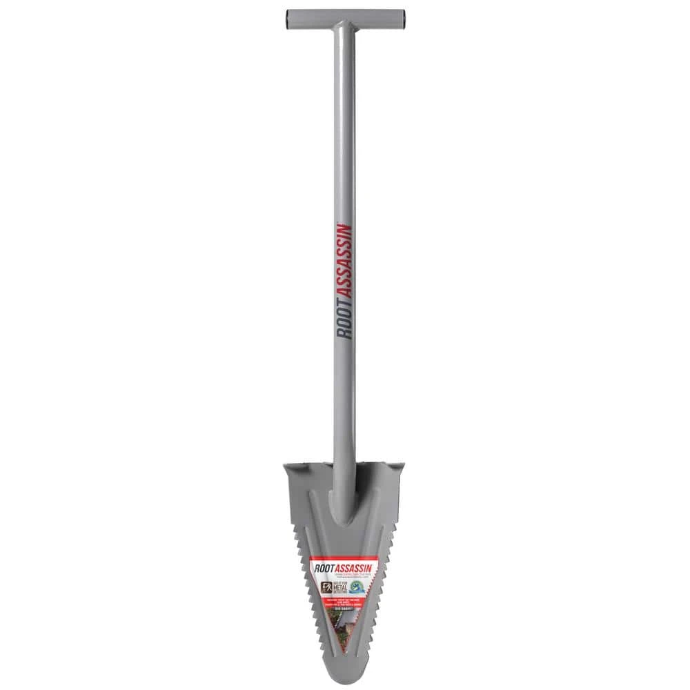 - Root Assassin short bladed serrated shovel with enhanced shovel shaped and curved tip