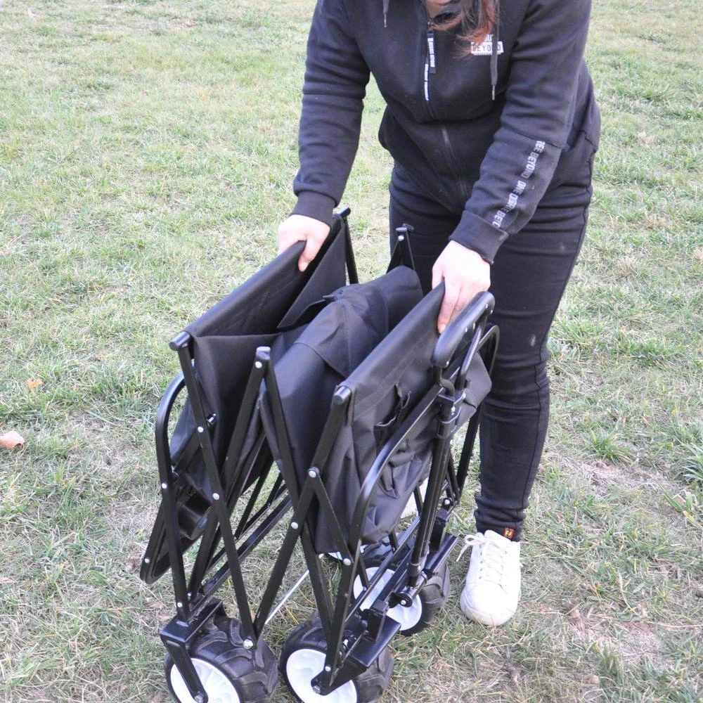 - Easy folding and storage outdoor wagon has internal pull rope design, a few seconds can easily fold and expand, without installation simple operation, the wagon can be folded up to just 8 in. thick, about 30 in. x 21.2 in. x 9 in. folded size and can be folded into a portable bag and space saving or easily stored in a closet, garage or car trunk