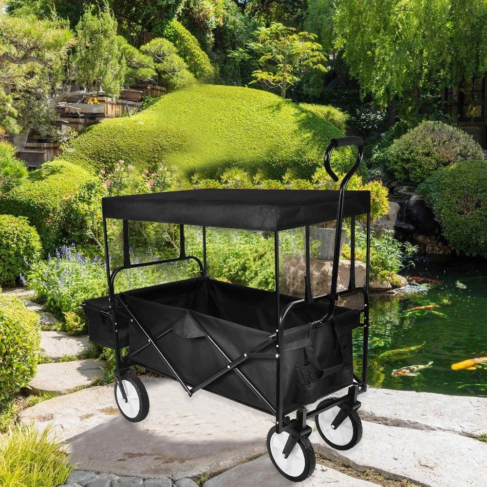 Collapsible outdoor wagon with canopy provides extra-storage basket and 2 mesh bags, making it more convenient and flexible for you to carry small goods. If you’re a do it all, super parent you know the struggles of trying to transport your kids’ toys and-day to-day necessities around at the beach or at a sporting event. For all those non-parents, you still know the difficulty of hauling groceries from the car to your home. No matter the scenario, this utility cart can handle it. From toys and groceries to everything in between, go with the Folding Outdoor Cart and lighten your load. Unlike other copycat carts, this 1 folds compactly and stores easily in your trunk, garage, or closet, ensuring easy transport. Plus, the best part is it takes only-seconds to set up and use. Lighten up your load and utilize this versatile cart for your everyday needs.