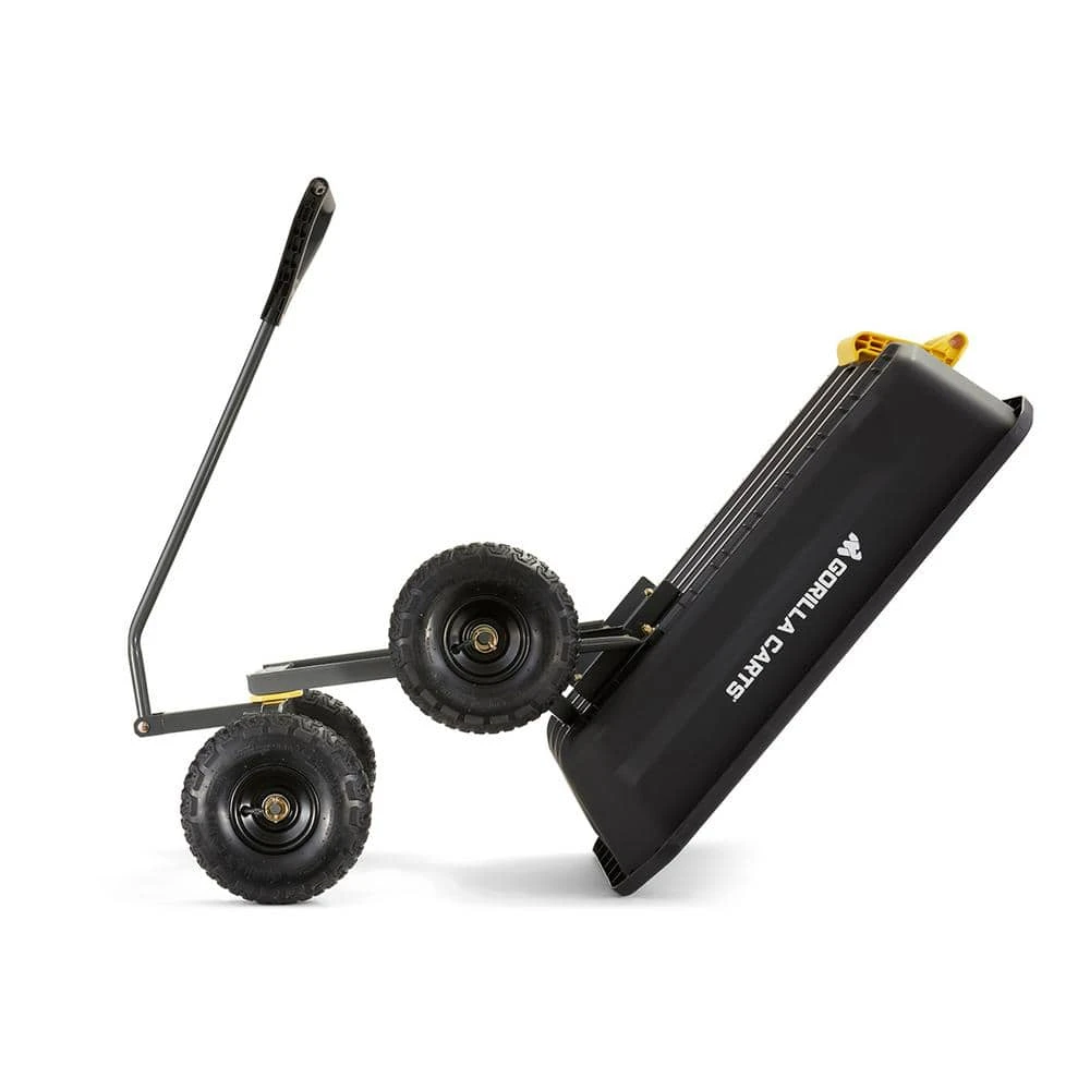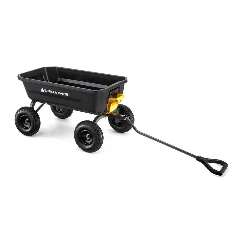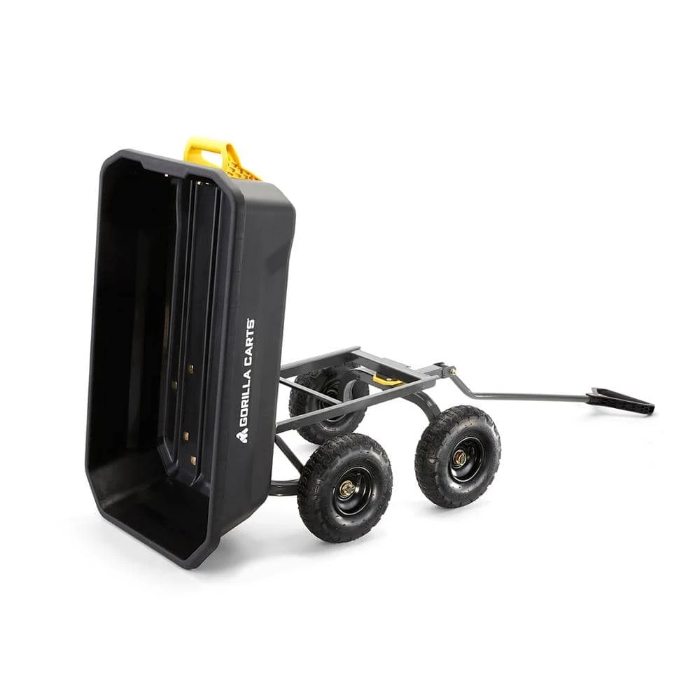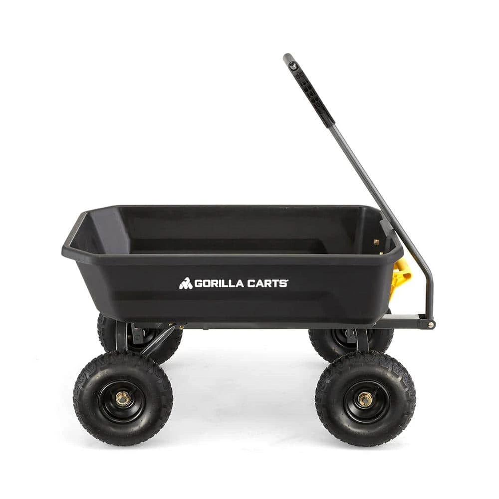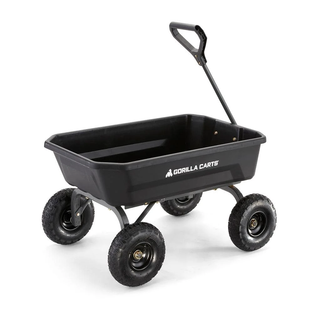 - Haul more than yesterday, the all-new Gorilla Carts 4 cu. ft. garden dump cart is the perfect companion whether you are gardening or cleaning up the yard, the poly garden dump cart has an innovative, updated frame design with a wider stance, 0-turn steering and an all-new full dump design, its a no ordinary full-dump design that Gorilla Carts has been perfecting, the patented roll-over dumping function makes it easy to unload anywhere, the durable poly bed is easy to clean and the 10 in. pneumatic tires will tackle any terrain