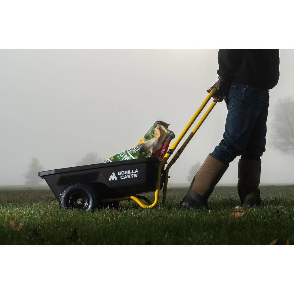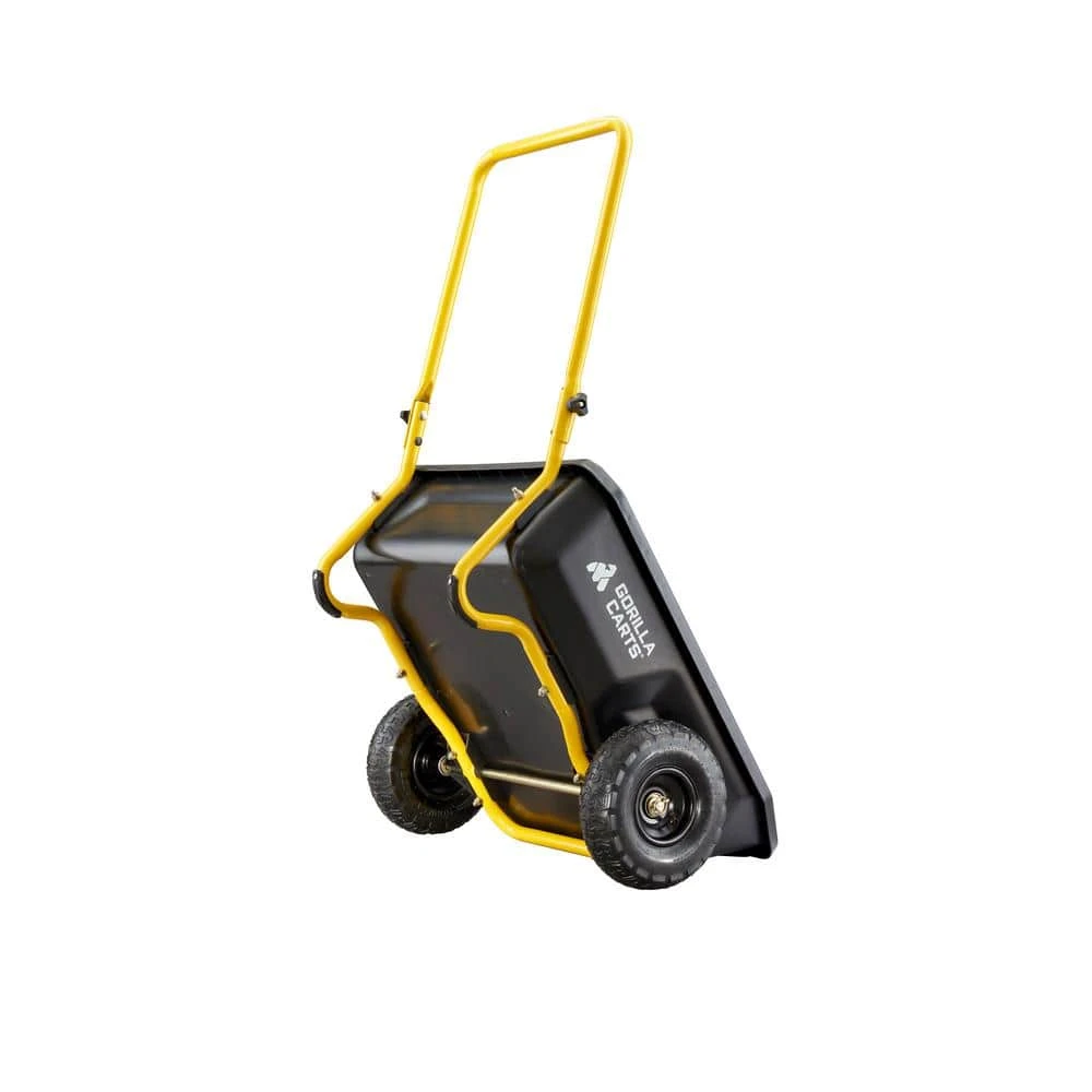The new Gorilla Carts 4 cu. Poly Yard Cart is a great alternative to an old-fashioned, hard-to-use wheelbarrow. The 30 in. L x 24 in. W tough poly bed is impact resistant and built to hold up to 300 lbs. Featuring a low center of gravity for amazing stability and maneuverability, this cart is perfect for all your outdoor project needs. The 10 in. pneumatic tires can roll easily over any terrain and the unique push or pull design ensures easy movement even with a heavy load of materials. The handle folds down for easy storage and assembly is quick and easy – meaning you can get right to work tackling your next project.