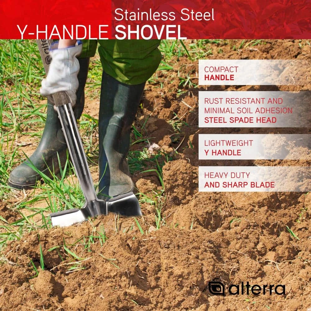 Upgrade your garden tools with the ALTERRA Tools Round Point Shovel. This round point shovel features a sharp stainless steel head that is durable and functional for years of quality use. The lightweight, sturdy handle is made of solid ash wood to provide a strong & comfortable hold that won’t wear out over time. The compact Y-design handle and scoop head makes this the perfect tool for digging in hardened soil or moving leaves, mulch and gravel. The ALTERRA Tools yard and garden shovel measures 40.5 in. x 8.5 in. x 5 in., the perfect length for a variety of landscaping jobs.