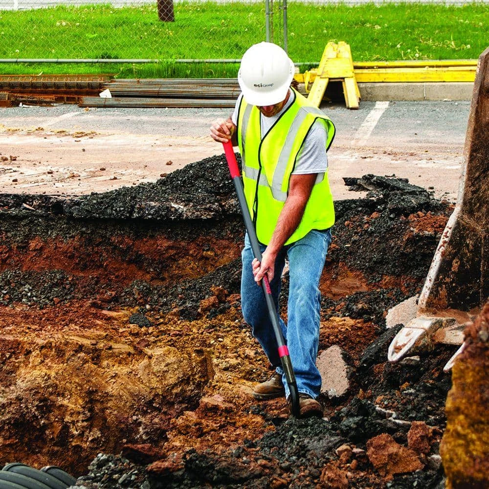 The Razor-Back round point shovel is tough enough to dig in the hardest, rockiest soil. It features a heavy duty, open back, industrial gauge, steel blade with a backbone ribbon of steel reinforcement along the socket. A crimped steel collar strengthens the handle to socket connection. The 48 in. fiberglass handle with cushion end grip provides ultimate strength and durability to withstand heavy duty labor.