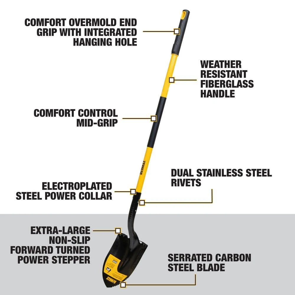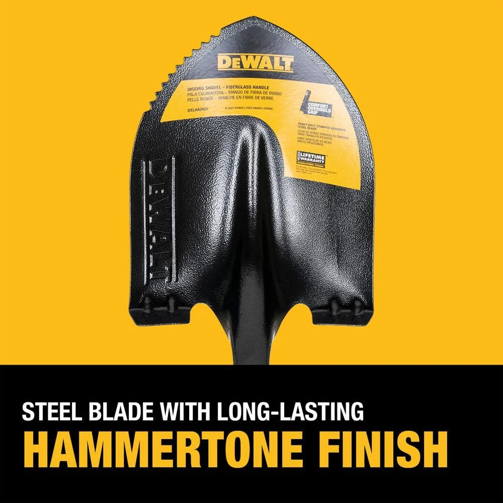 Rigorously tested for real-world toughness, you can take on a range of jobs with confidence using this 49 in. Fiberglass Handle Digging Shovel. The heavy-duty shovel quickly cuts through and breaks apart compacted dirt and soil with its heavy-duty, serrated carbon steel blade featuring a long-lasting, multi-step hammertone finish. Great for digging a variety of holes in different types of soil, the tool features an integrated hanging hole so you can conveniently and efficiently store it at the end of the workday. The extra-large forward turned punch embossed power stepper and steel power collar provide the strength and stability to power through nearly any job. The dual stainless steel rivets securely attach the shovel head to the handle for long-lasting performance and durability. Its long, heavy-duty and weather resistant fiberglass handle helps reduce strain on the back and knees during prolonged use, and the overmold end-grip and mid-grip allow for low-burden, two-handed use while providing enhanced leverage.