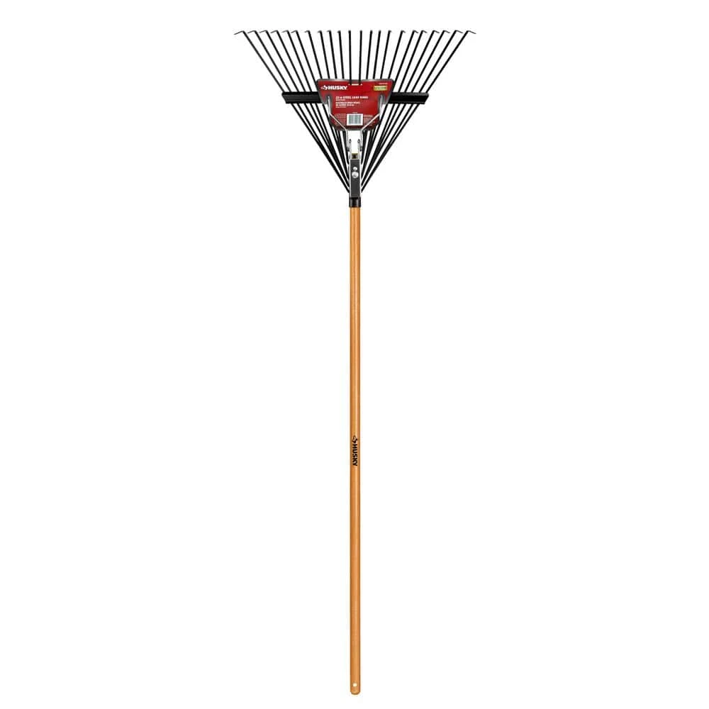The Husky 22 in. steel leaf rake is designed to sweep any surface. The steel tines provide resistance to remove leaves and other materials in the garden with facility. The long wood handle offers comfort during use.