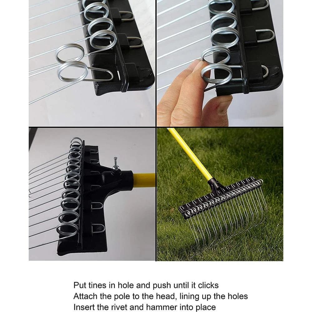 - 28 angled spring-loaded steel tines, 55 in. yellow fiberglass handle, 21 in. head with a swivel hanger at the end of handle for easy storage
