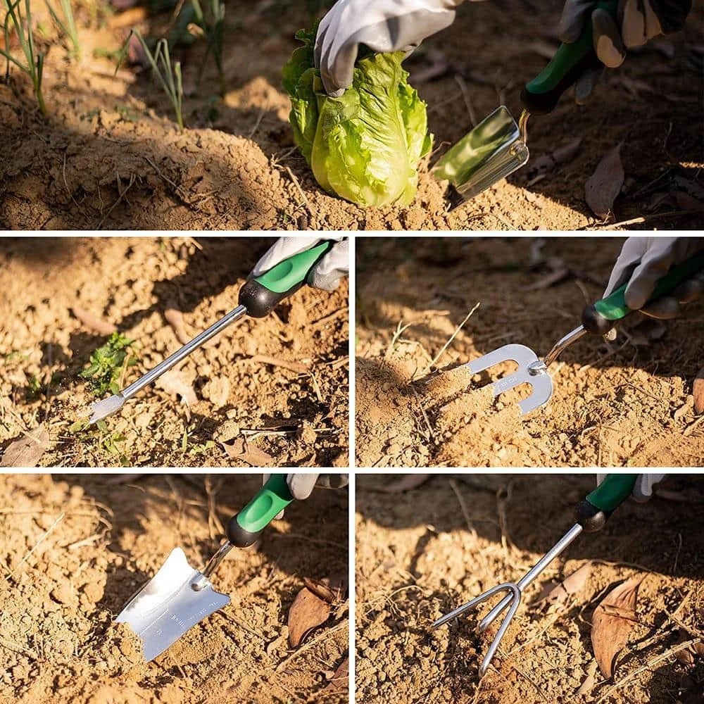 - Beautify your garden: use the cultivator and rake to aerate soil, remove weeds and clean dead leaves before planting, the trowels and transplanter are great tools for digging soil and transferring plants, while the pruners cleanly cut plants while minimizing injury, last, the weeder quickly and easily removes stubborn weeds below the surface so they don’t grow back