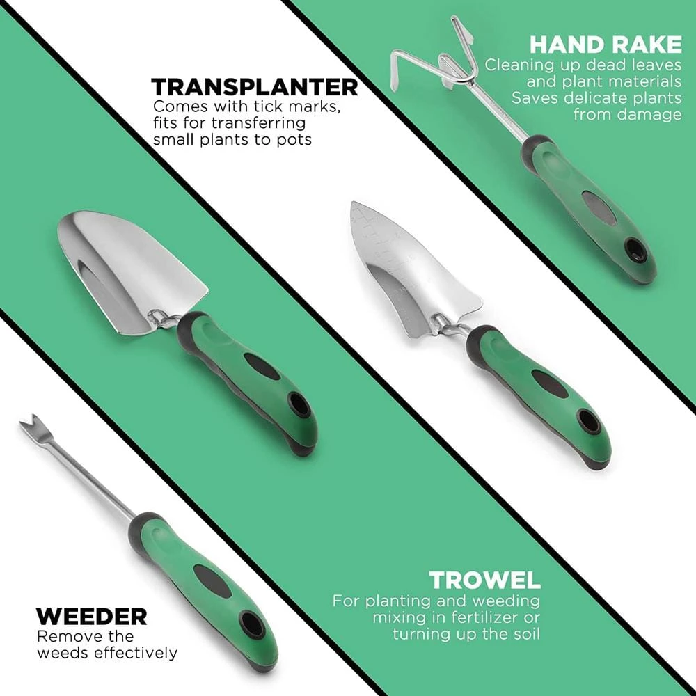 - All-in-1 garden tool set: this kit includes all of the garden tools to get you started on growing your own food or admiring beautiful flowers, the kit includes a stainless steel cultivator, trowel, transplanter, hand rake, weeder, bypass pruner and non-slip gloves
