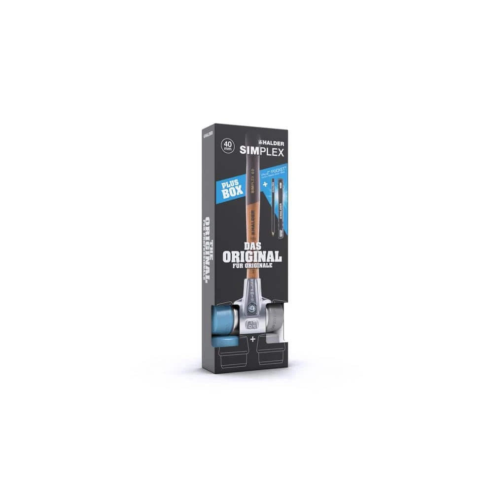 The Simplex Bonus Box Set contains a 3113.040 mallet and a spare grey rubber replacement face and a spare blue rubber replacement face. Also included is a Halder carpenter pencil and a Pica pencil holder/sharpener. The Halder Simplex mallet is the signature hammer in the Halder line. This variation of the patented Simplex hammer features a lightweight aluminum housing. The aluminum housing makes this mallet very lightweight, perfect for more delicate and precise work but its rugged design allows it to deliver powerful blows if needed. The split housing allows it to be taken apart and the components can be replaced when worn or damaged. The face inserts consist of a medium hard grey non-marring rubber and a soft blue non-marring rubber. The faces are held in place by pressure, not screwed in. This allows for a much greater wear area and longer life. The Simplex hammer can be replaced and modified to use several other face materials for different applications. This aluminum Simplex with grey and blue rubber faces are excellent for a number of jobs including finish carpentry, trim work, furniture building, craft and hobby work, wood and laminate flooring and tile installation, just to name a few. The Simplex features the highest quality acacia hard wood handle which is protected by an extra-large over-strike area formed by the housing. This truly is a durable hammer and will be with you for many years.