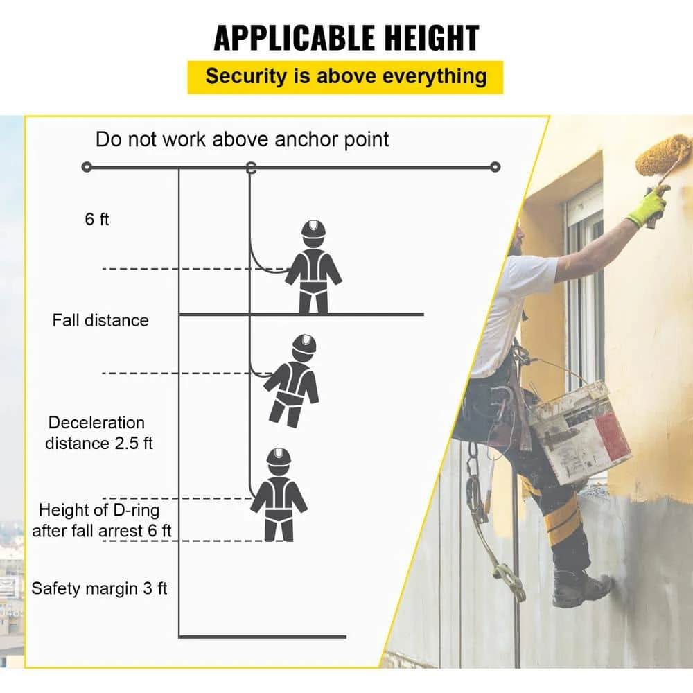 Our VEVOR lifeline assembly is a necessary tool for fall protection. Made of solid and durable polyester, wear-proof for long-lasting use. The rope comes with a secure energy absorber, adjustable rope grab and solid steel snap hooks. It is ideal for ensuring security for people who need to work at a high altitude.