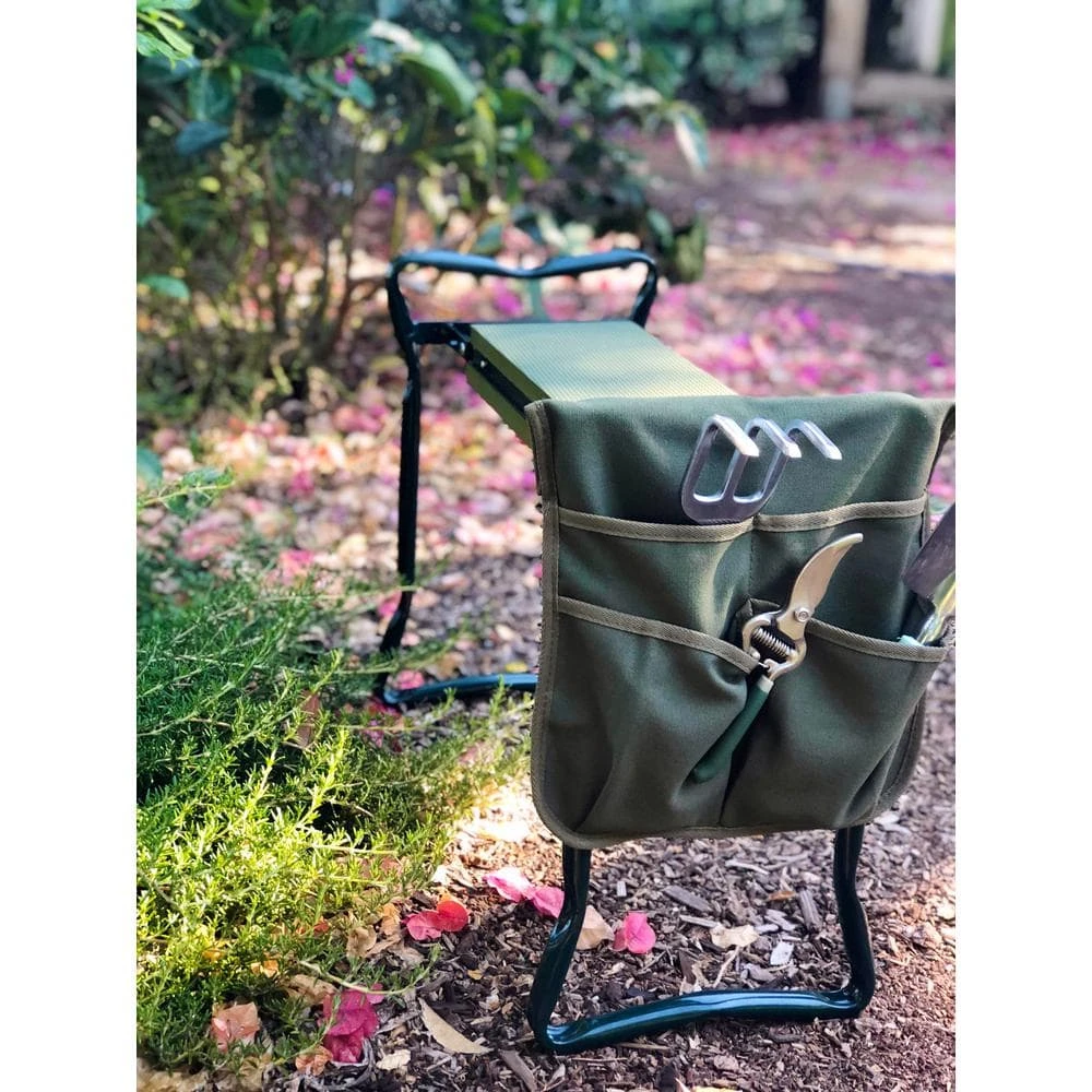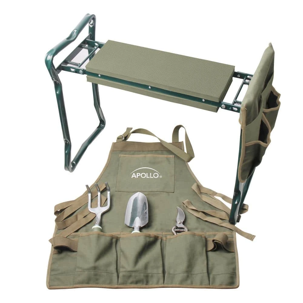 - Included: foldable kneeler and seat, tool pouch with 4-pockets, cotton gardening apron, 12 in. trowel, 12 in. rake, 8 in. pruners