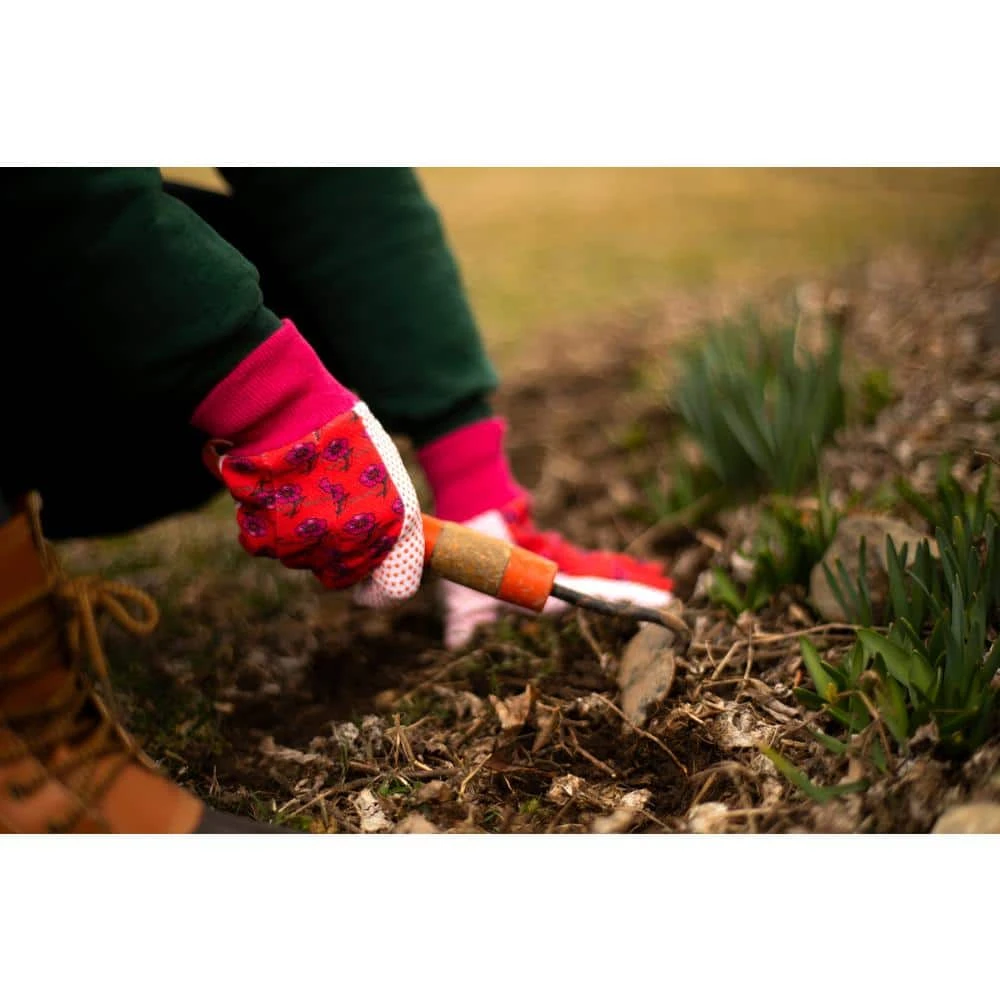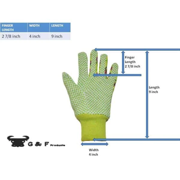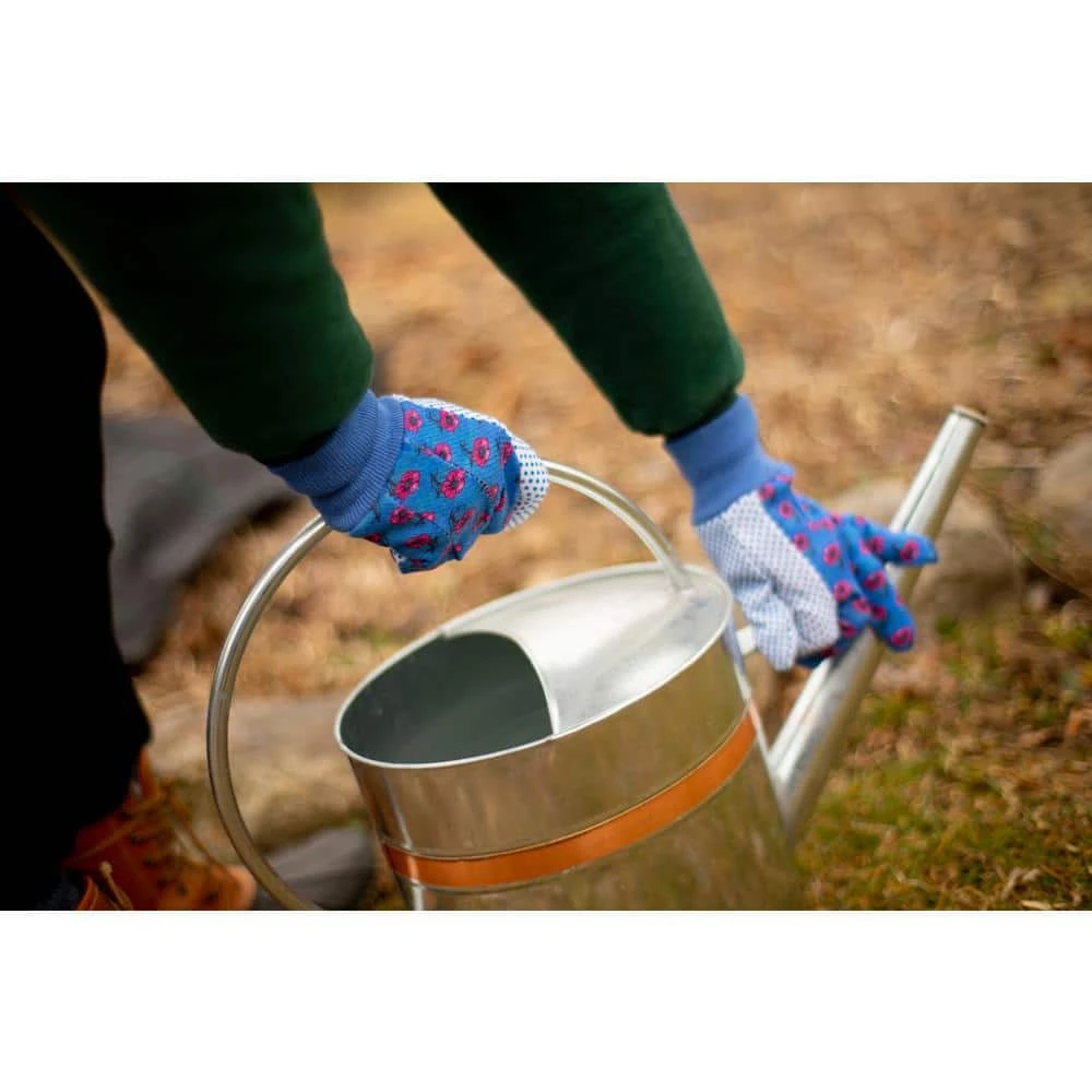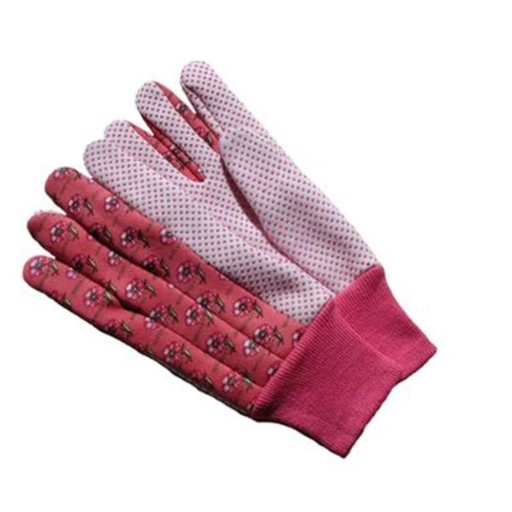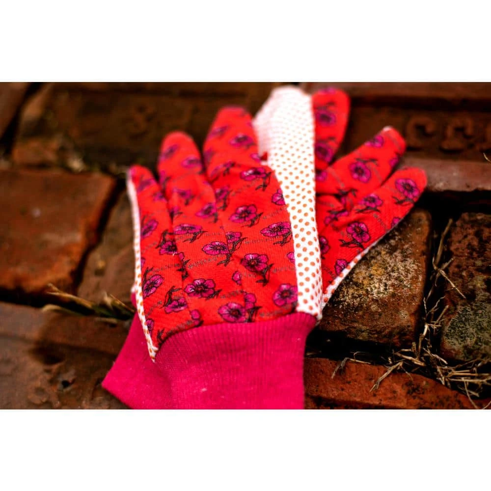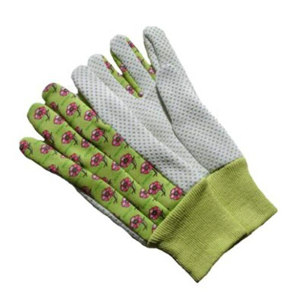 Cotton soft jersey garden gloves. Flower print with knot wrist to keep dirt out with PVC dots for extra grip. 3 Pair per pack with Green Red and Blue color. Sold by pack (3 pairs, green, red, blue each).