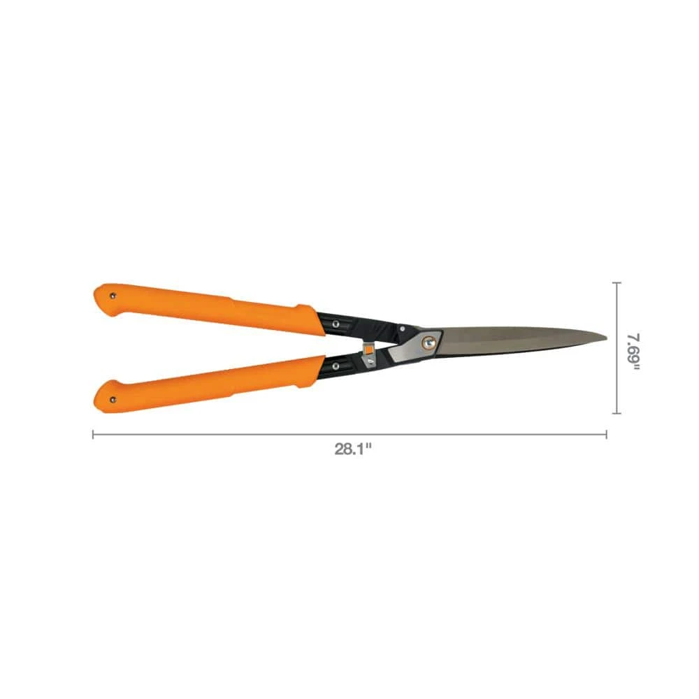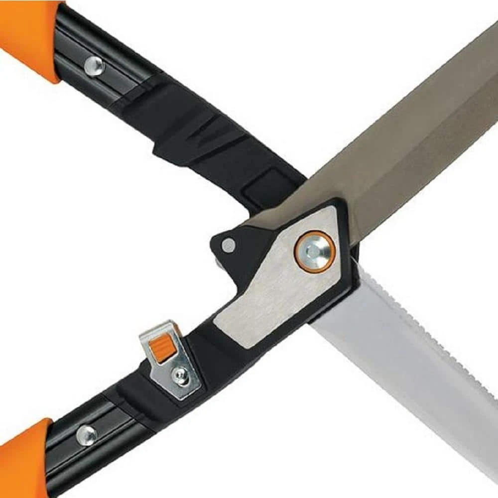 Fiskars Pro Hedge Shears feature SpeedDrive lever technology for 50% faster cutting than traditional hedge shears. Extruded aluminum handles paired with heavy-duty, riveted connections ensure ultimate durability, while thicker, high carbon steel blades stay sharp longer for reliable, long-lasting performance. Serrated to grip hedges and stems for clean cuts, these blades are also easy to sharpen and replace and are covered with a non-stick coating to help reduce cut force. A superior ergonomic design includes multiple grip positions on the handles for reduced repetitive fatigue, as well as high-visibility, Softgrip handles for enhanced comfort and control. A secure, shock-reducing bumper lessens impact. The simple, heavy-duty construction of these hedge shears makes them a reliable choice for daily, quality performance under all conditions.