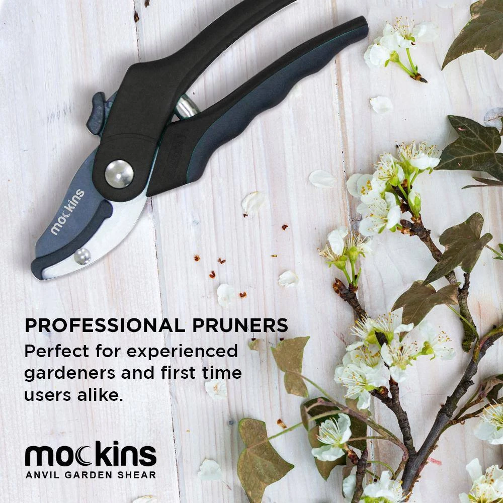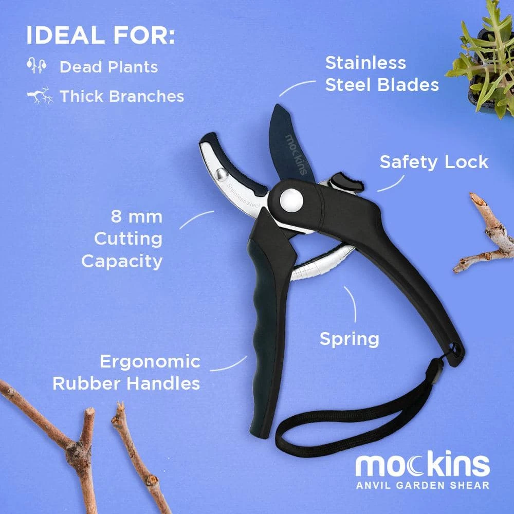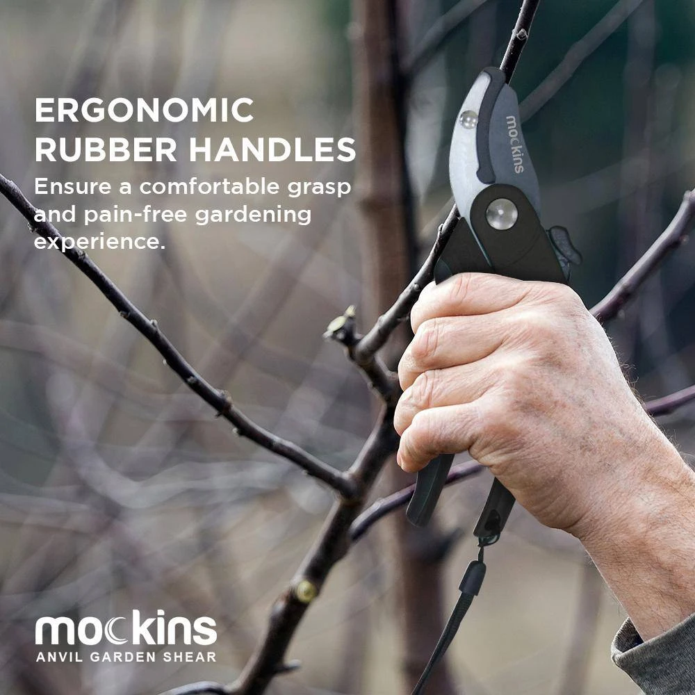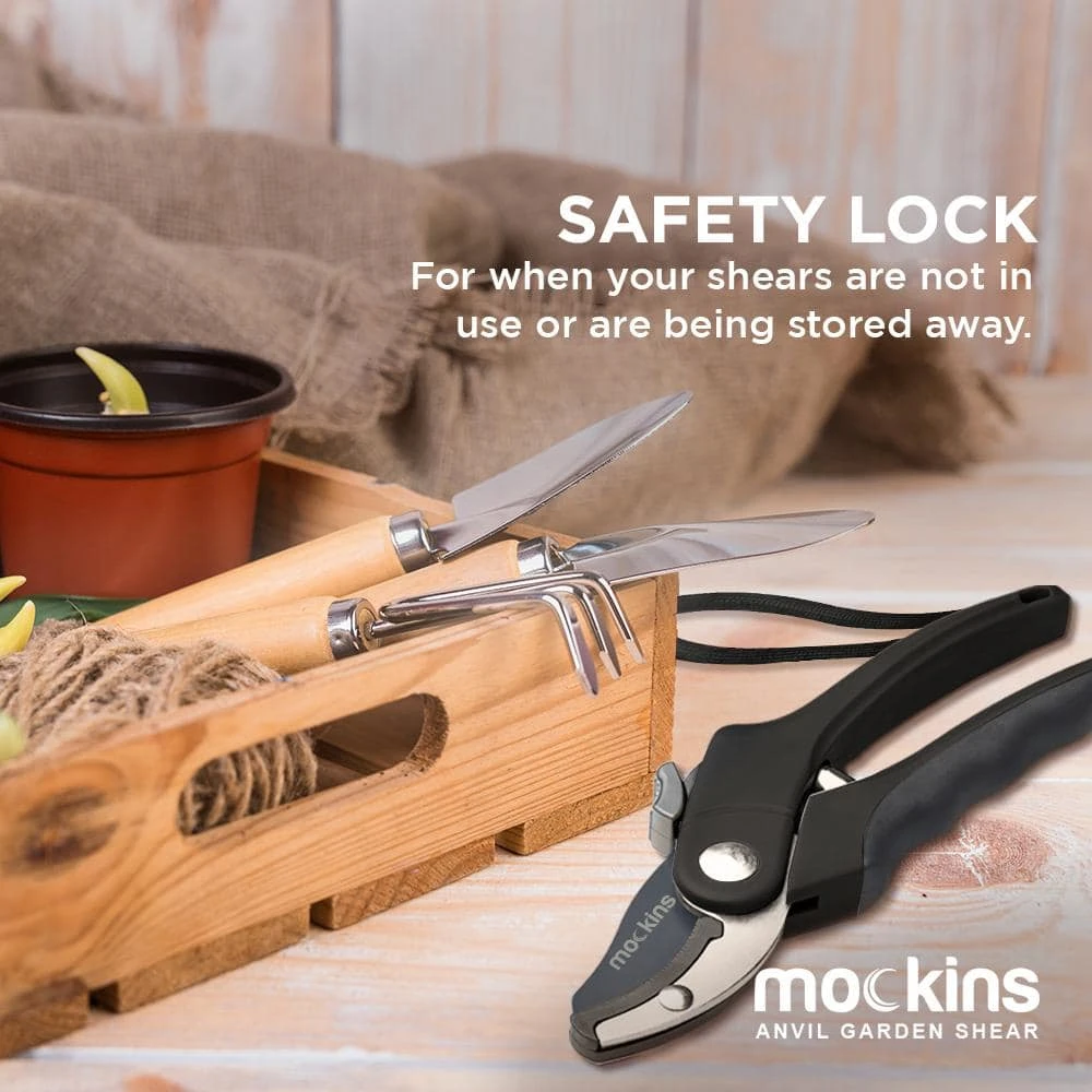 Simplify your gardening routine with these Mockins Professional Heavy-Duty Garden Black Anvil Shears. Ideal for use for both professionals and amateurs, this handy backyard tool features sharp stainless steel blades to work against stubborn branches and leaves. Its ergonomic rubber handles ensure a secure grip while keeping physical strain to a bare minimum. This clipper has a safety lock to enable secure storage when not in use.