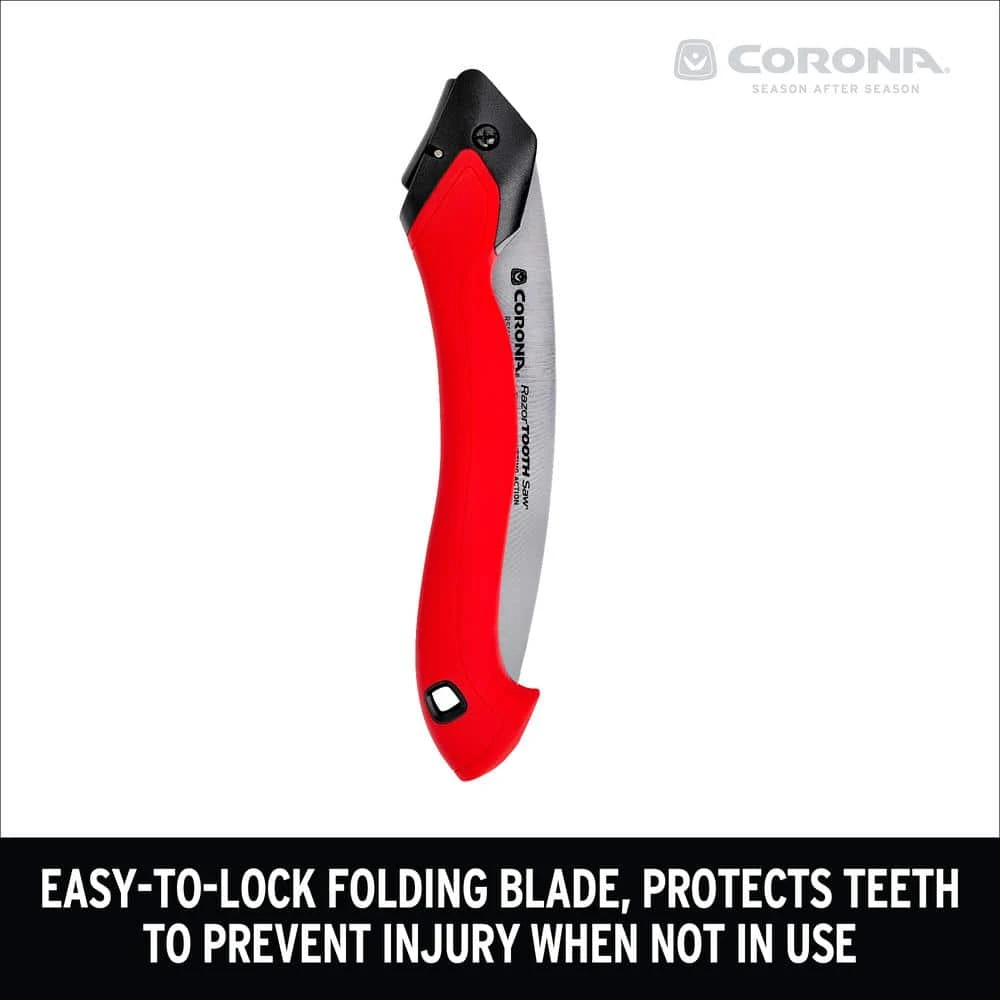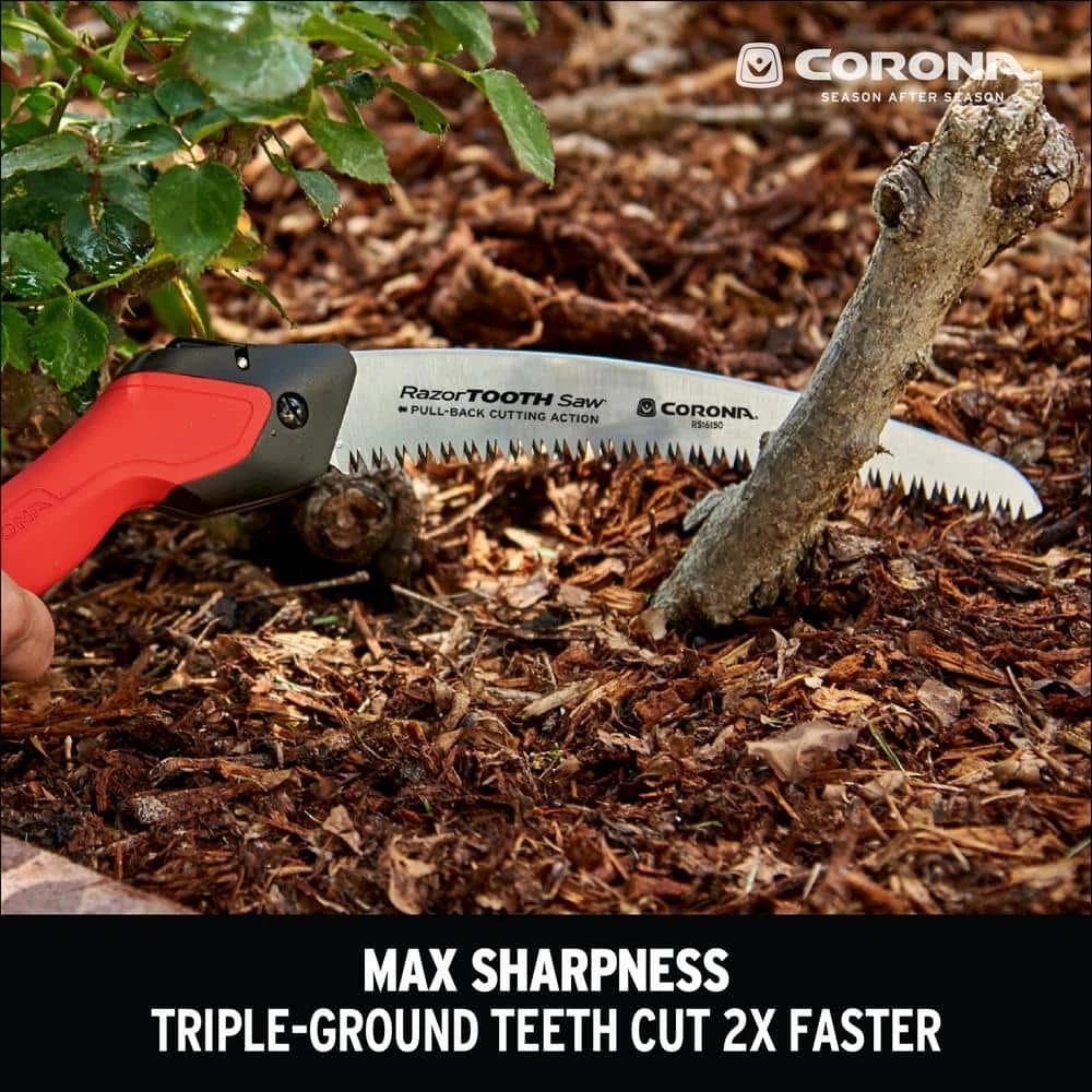Combining RazorTOOTH SAW technology and an ergonomic non-slip handle, this 10-inch Corona folding saw gives you a confident and comfortable grip while efficiently cutting through green or dry branches with twice the speed of a conventional hand saw. The 10-inch curved blade has an extended reach and can cut branches up to 6-inches in diameter, making it ideal for tree trimming and a great addition to your workshop or essential gardening hand tools. When folded, the handle fully covers the teeth of the blade for safe, compact storage and easy transportation when camping, backpacking, hiking or ATV riding.