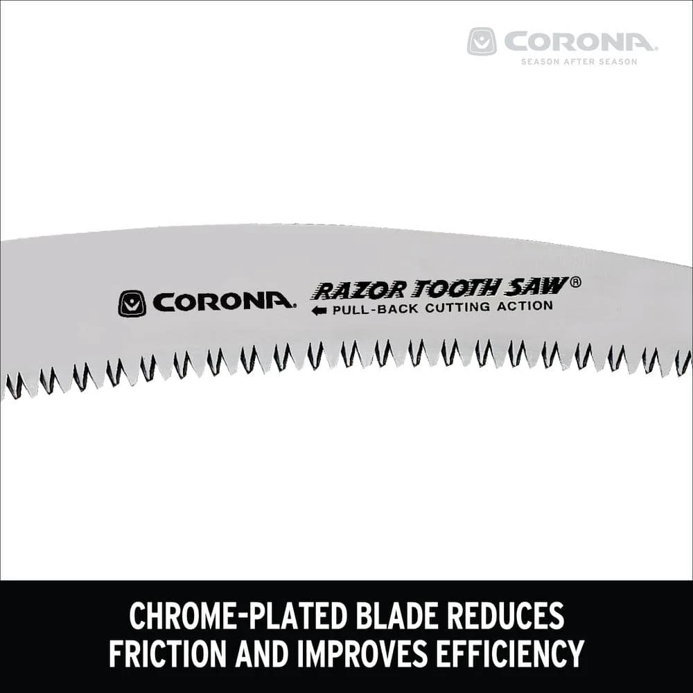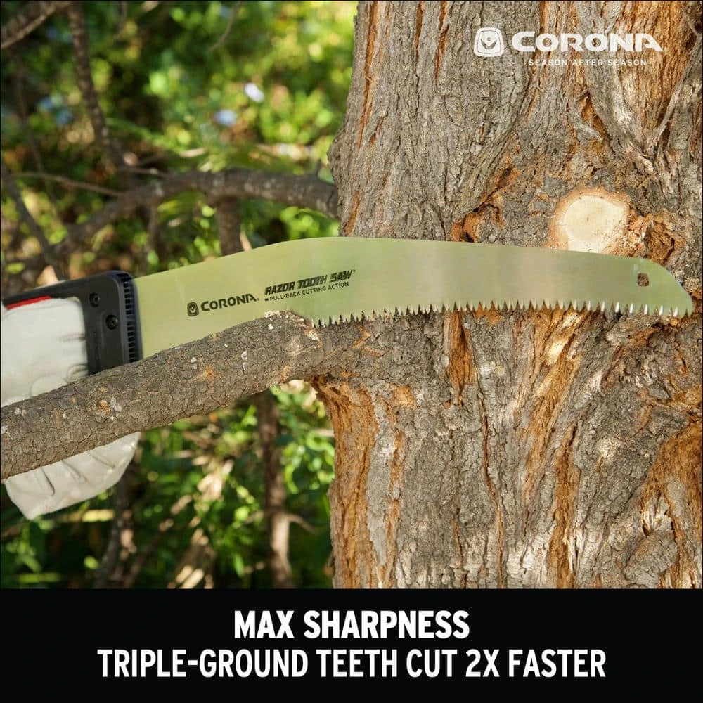 This heavy-duty Corona 18-inch pruning saw is designed for cutting large green or dry branches up to 10-inches in diameter and has RazorTOOTH SAW technology for removing twice as much material per pull stroke as a conventional hand saw for trees. The patented ergonomic, non-slip D-handle is designed for comfortable gloved or two-handed use, allowing you to tackle large jobs with less strain and fatigue. The high-quality curved blade cuts smoothly and efficiently to finish jobs in half the time, making this tree trimmer ideal for professional landscapers and arborists, as well as experienced homeowners who need durable garden tools for regular property maintenance.