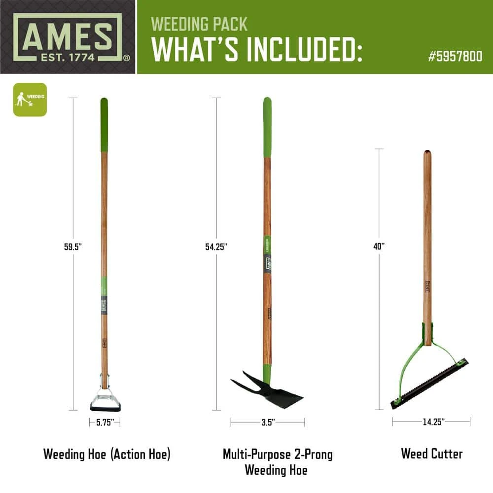 Tackle weeds and tall grass with this weeding tool set. This all-in-one wood long handle set includes a weeding hoe, a 2-Prong weeding hoe, and a grass weed cutter. The durable weeding hoe features a 54 in. hardwood handle and looped steel blade for push-and-pull action to remove weeds easier. Designed for close cultivation around existing plants, the multi-purpose weeding hoe features a flat side for chopping, weeding and clearing, as well as a pointed side for cultivating and turning soil. This durable weeding set features wood handles, cushioned end grips and strong connections for additional durability.
